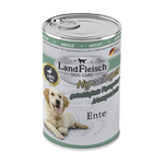 LandFleisch Hypoallergen Ente setzt auf 68 % hochwertiges Entenfleisch und Innereien, darunter Fleisch, Lungen, Herzen, Mägen und Hälsen, als einzige tierische Proteinquelle. Diese Monoprotein-Rezeptur ist besonders geeignet für Hunde mit Futtermittelunverträglichkeiten oder sehr sensibler Verdauung.